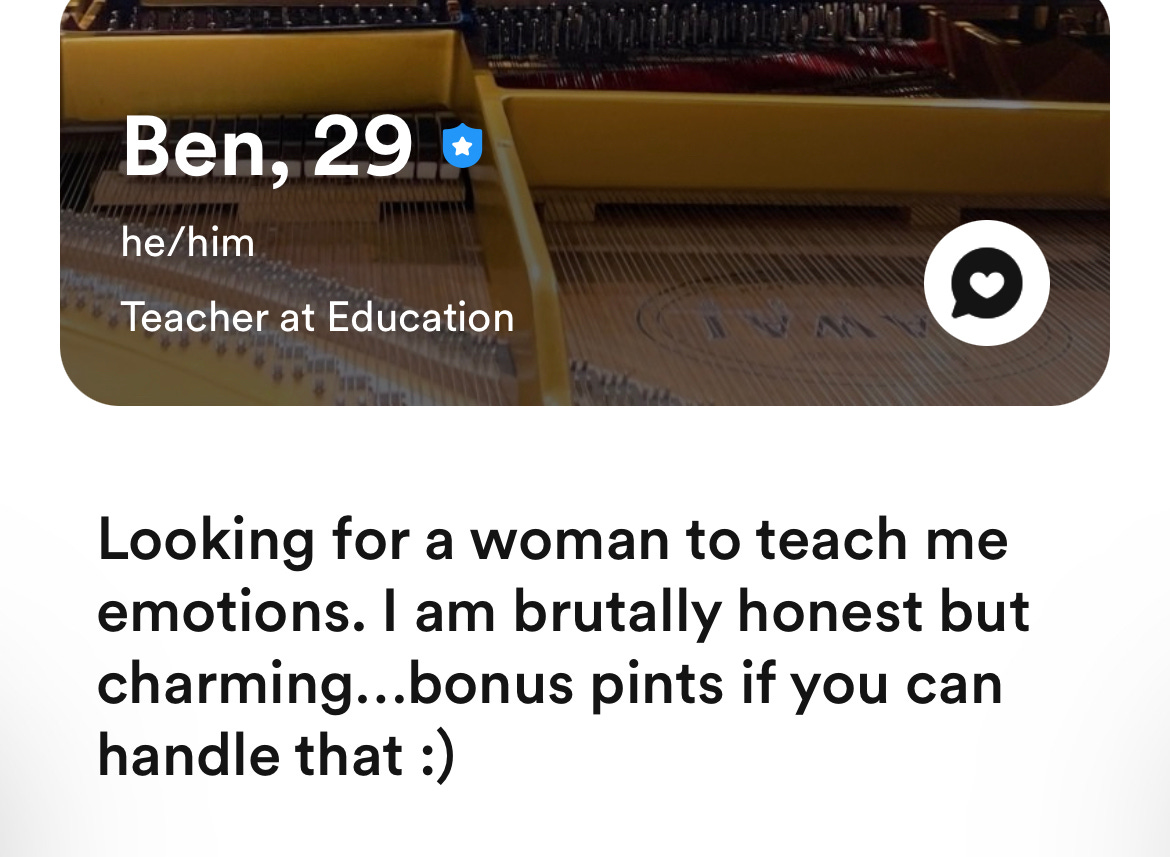 We’ve all had to work on ourselves, Ben! At 29 I’d hope you’d understand emotions yourself, but I’d strongly recommend a therapist. While you’re there, get your therapist to explain to you that being “brutally honest” isn’t actually a good quality. Have you never watched an episode of MAFS? C’mon now.