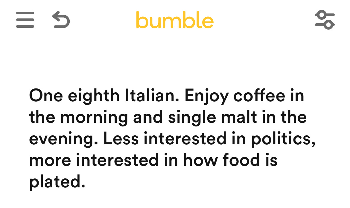 We’ve learned so much about this man while learning so, so little at the same time. I think my favourite part is that this is the worthy information he deemed important, as though being 1/8th of any nationality is fascinating, and as if liking coffee and a single malt is a personality trait.