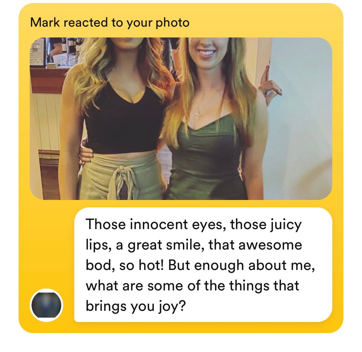 It stands for dating apps too. After four years on and off the apps, mere words or sentences can give me the ick faster than you can say the words “Myer-Briggs.” My friend and I were discussing the other day how tiring it is to have another man open the chat with “Hey trouble”, as though that’s an enticing way to get to know someone. There’s truly nothing like reading a “hey trouble ;)” message on a Monday night, when you’re home watching MAFS while wearing a face-mask under the guise of doing something nice for yourself as your cortisol levels go through the roof watching Olivia be a pest. (And if you ever truly want to learn what you DON’T want in a future partner, I cannot recommend watching MAFS enough).